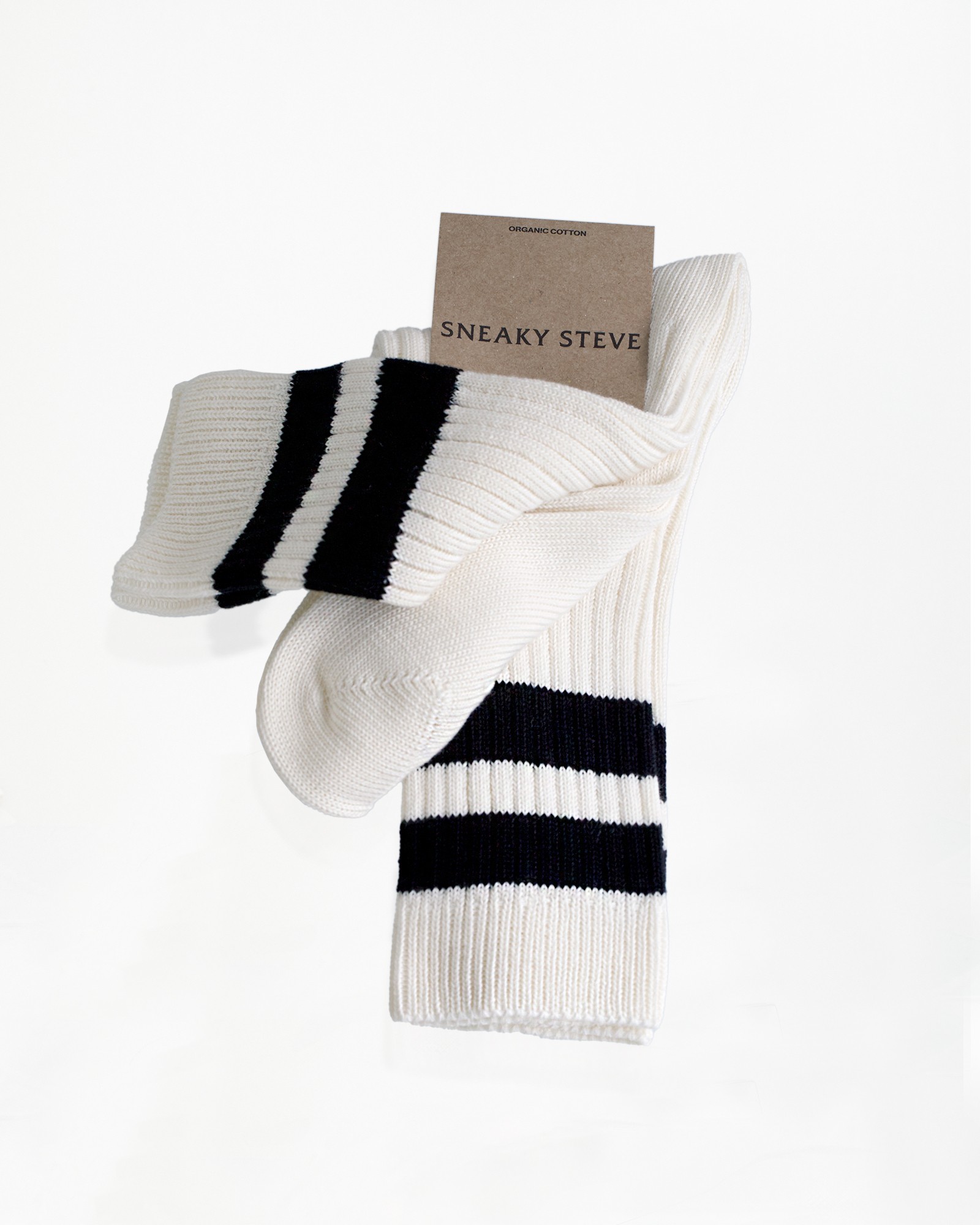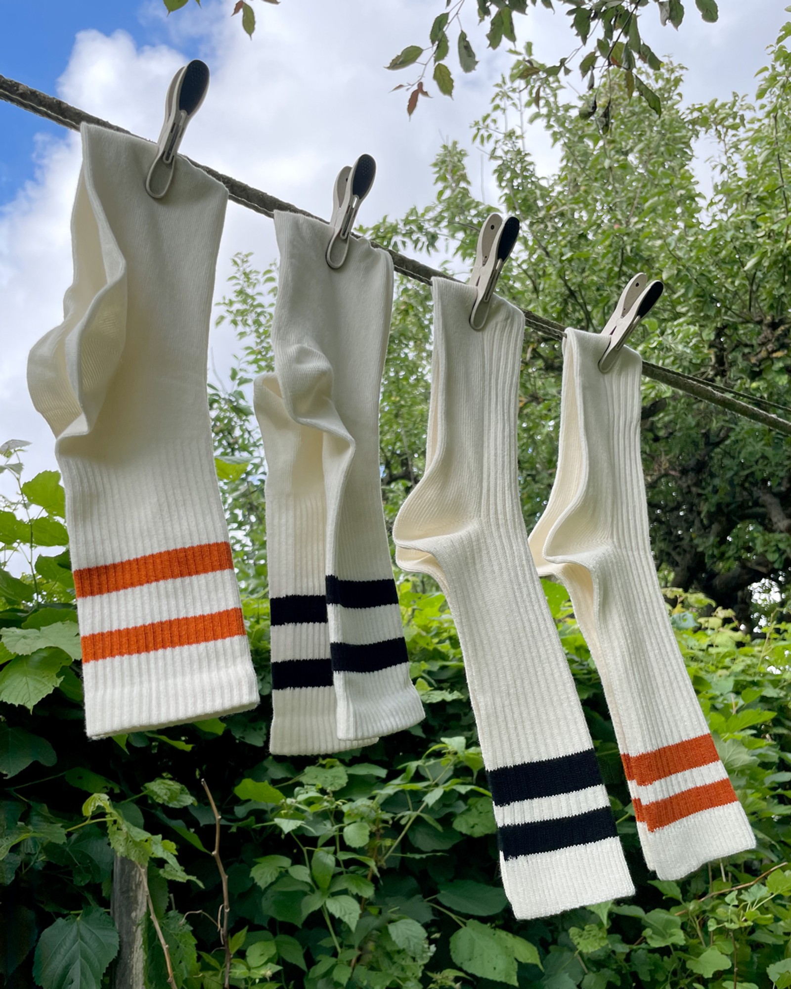 Inspired by nostalgic sock-characters from a beloved 1980s kids' show, our Yster socks are crafted in Portugal from 100% organic cotton. These ribbed socks feature vertical, raised stripes that not only add a unique style but also enhance elasticity and durability. The ribbing helps keep the socks in place and provides a comfortable fit, perfect for those who appreciate both function and style. Available in off-white with your choice of orange or black stripes, they add a playful touch to any outfit. Sizes range from 36-45. Get two pairs, in one color, for just 199 SEK.